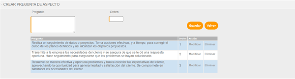 Si quieres modificar o eliminar algún Aspecto ve a la grilla de datos y haz clic en el link Modificar o Eliminar según lo que quieras hacer
