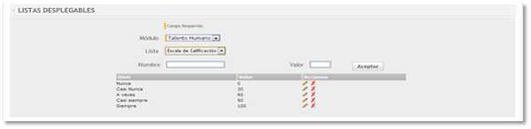 - La escala con la que se califican las preguntas de la evaluación se parametrizan a través de la Configuración, listas desplegables