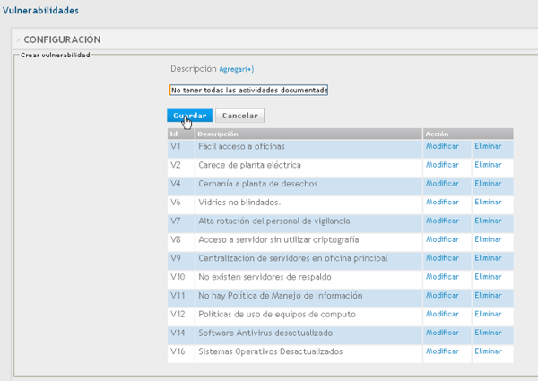 - Las vulnerabilidades creadas van a quedar referenciadas con el id V y el número del consecutivo, es decir, V1, V2, V3….etc