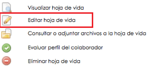 2. Haz clic en el segundo icono Editar hoja de vida, este Icono sólo será visible si cuentas con los permisos asignados desde la configuración del módulo o eres administrador del sistema.