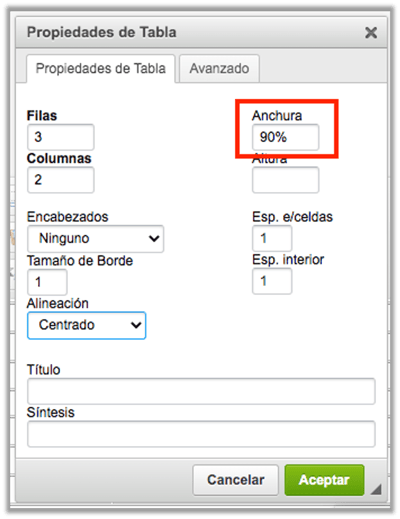 - En el cuadro que se activa ve al campo Anchura, el cual por defecto el editor lo toma en pixeles, y para que puedas manejar mejor la dimensión de la tabla en la hoja déjalo en porcentaje como se ven la imagen 👉