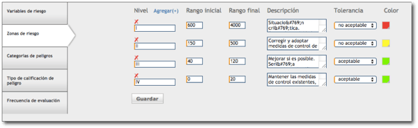 Configura las zonas de riesgos de la matriz de peligros y riesgos de seguridad y salud