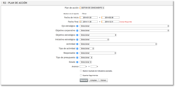 1. Una vez seleccionado el reporte R2 selecciona la información de los filtros para refinar la búsqueda, luego haz clic en Generar