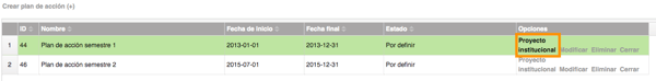 - En la grilla de planes de acción identifica el plan de acción al cual le vas a crear la actividad y haz clic en link Actividades, en la imagen se cambió el nombre de la etiqueta Actividades y se re-nombró como Proyecto institucional