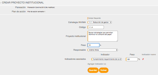 - Abrirá una página donde está el nombre de la planeación y del plan de acción , haz clic en el link Crear Actividades que para nuestro ejemplo se re-nombró por Proyecto institucional (+)