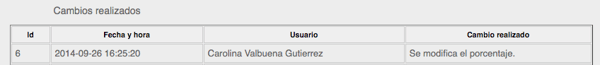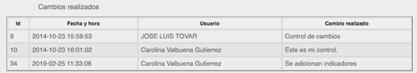 - Cuando realices una modificación se activará un campo de control de cambios, estos quedan almacenados en la grilla inferior con su: Id, fecha y hora, usuario y cambio realizado, así: