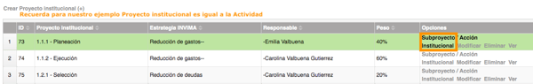- Abrirá una página donde está el nombre de la planeación, del plan de acción y de la actividad, haz clic en el link Crear Subactividades que para nuestro ejemplo se re-nombró por Subproyecto institucional (+)