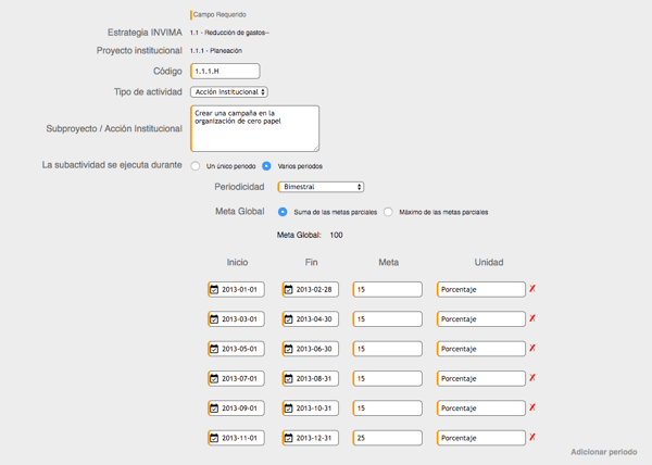 - Si lo requieres modifica la fecha de inicio y fin del periodo de la subactividad, agrega la Meta y Unidad de medida de cada ítem dependiendo la periodicidad que hayas dado