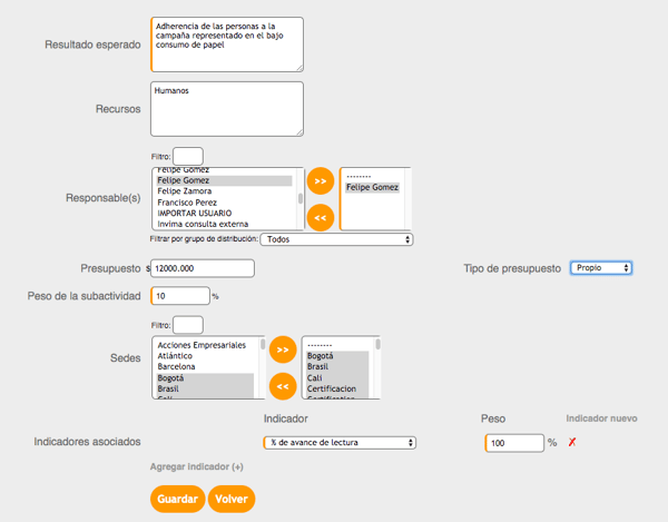 - Selecciona el usuario responsable de la actividad y asocia indicadores de cumplimiento