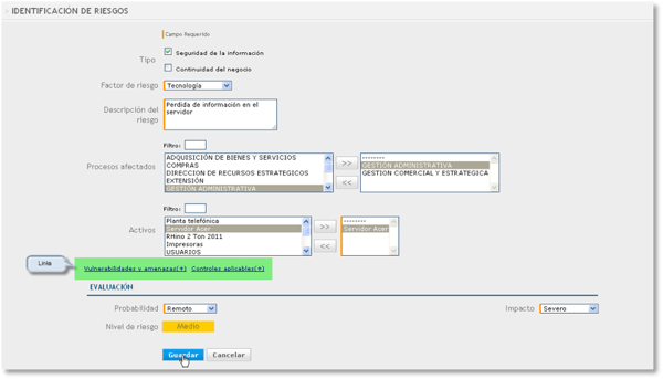 9. El sistema abrirá nuevamente el formulario y se activarán dos links: Vulnerabilidades y amenazas(+) y Controles aplicables(+)