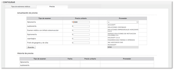 Ruta: Seguridad y Salud + Exámenes médicos + Configurar + pestaña Precios
