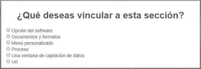 1. Opción del software: El sistema muestra una lista desplegable con los módulos activos y sus respectivas opciones en una estructura similar a la del campo procesos. Al seleccionar un módulo el sistema abre el menú de ese módulo, si se selecciona una opción abre la página que tenga asociada.