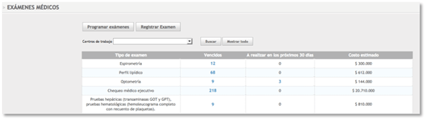 En esta opción puedes programar por vigencias y gestionar todos los exámenes que están vencidos, pendientes por aplicar y el costo estimado de estos. Adicional se pueden realizar filtros por centro de trabajo.