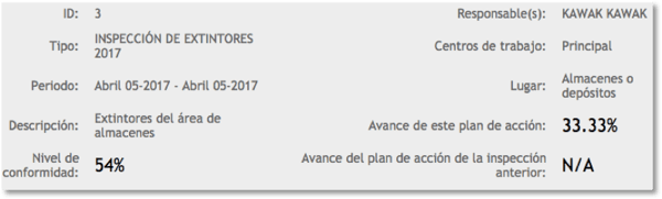 El Avance del plan de acción de la inspección anterior, muestra el porcentaje de la inspección aplicada del mismo tipo y en el mismo lugar, si no existe una anterior sale NA como se ve en la imagen anterior