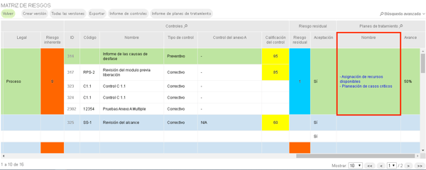 - En la columna anterior al porcentaje de avance de los planes de tratamiento se listan los planes de tratamiento por nombre, separados por saltos de línea y tienen asociado el riesgo, siendo un hipervínculo al ver de cada plan
